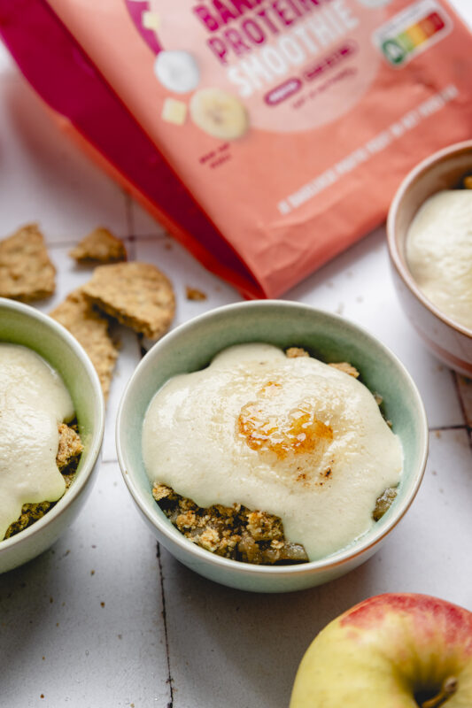 - Verdeel het appelmengsel over 3 schaaltjes. Daarbovenop verdeel je de havermout crumble. Als topping voeg je ongeveer 2 el van de Fast Fruit mix toe per schaaltje.