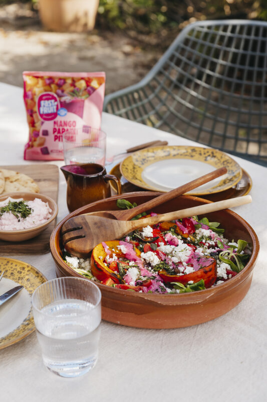 Een kleurrijke Indian Summer couscoussalade met geroosterde pompoen, romige feta en een frisse roze Fast Fruit dressing.